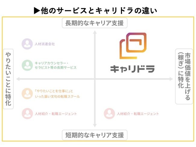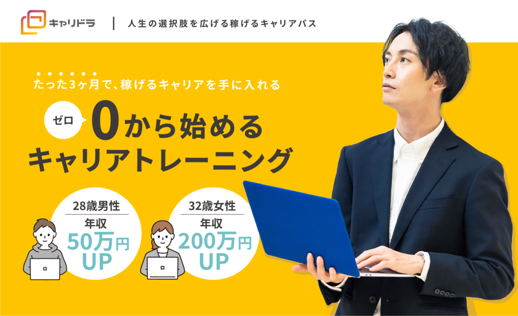 キャリドラは理想のキャリア実現と年収アップを目的に、経験豊富なキャリアコンサルタントが1対1でキャリアプランの設計や専属トレーニングを行うサービスです。