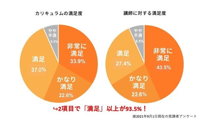 2021年9月1日現在の受講者に、カリキュラム内容と講師の2つの項目について満足度を調べるアンケートを実施しました。その結果、両項目について「満足」「かなり満足」「非常に満足」と回答した人は93.5%でした。