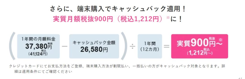 もともとの月額料金も安いのに、さらにキャッシュバックがついちゃうから、1年間で換算すると実質月額料金が900円(税抜)、税込価格でも1,212円とかなりお得になるんです。